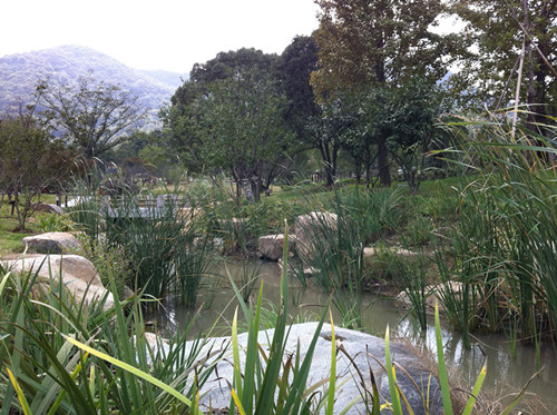 本工程位于山水如畫、鐘靈毓秀,自然人文景觀極為豐富的余杭區塘棲鎮,是杭州市風景名勝的一個重要組成部分。工程通過開挖水體,營建長廊、飛橋、湖心島,營造“君子淵”景觀,使整個北園盡顯“疏影橫斜水清淺”的迷人詩境。